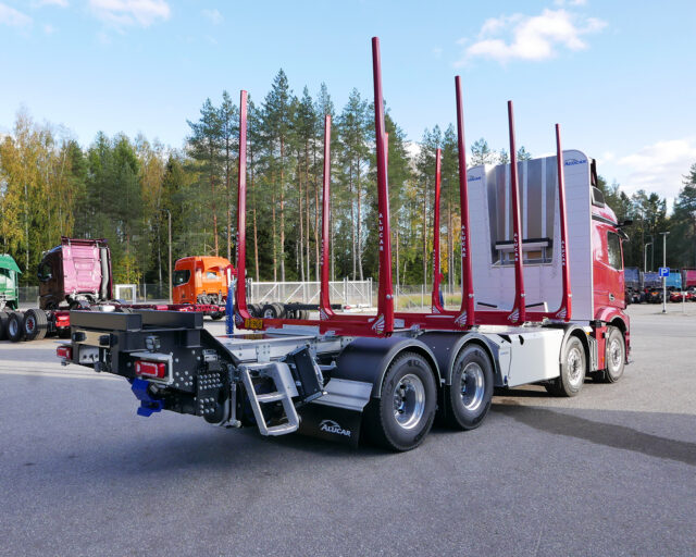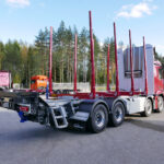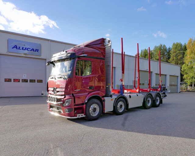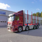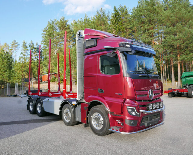 Papinaho Oy Mercedes-Benz – September 2025 Owner Papinaho Oy Load length 7680 mm Number of Axles 4 Wheelbase 5200 mm Crane console Fixed cranebracket Bunks Eagle 75i Other Headboard with grapple rack bag, LS-hydraulics, Parker eVP1-130 variable pump with electronic regulator, oil cooler, waterpiping to crane cabin, pneumatic load tensioners and built-in tensioner in one bunk, toolbox with integrated ladder, Icefighter sanding gear 90 liter