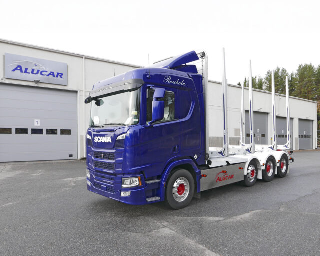 Kuljetus J.T. Raukola Oy Scania – Lokakuu 2025 Omistaja Kuljetus J.T. Raukola Oy Kuormatila 7220 mm Akselimäärä 4 Akseliväli 4950 mm Nosturiteline Irrotettava nosturiteline Pankko ExTe A7 Muuta Ohjaamosuoja kouratelineellä ja LED-valoilla, ulkopuolinen tuppi nosturitelineelle, matala apurunko, säätötilavuushydrauliikka, Parker eVP1-130 pumppu jossa sähkötoiminen säädin, Multi Stucchi, ExTe TU kuormankirsitimet, kippaava sivualleajosuoja, irrotettavat lokasuojat