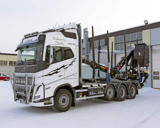 Kuljetus K. Saari Oy Volvo – Helmikuu 2026 Omistaja Kuljetus K. Saari Oy Kuormatila 7200 mm Akselimäärä 4 Akseliväli 4900 mm Nosturiteline Irrotettava nosturiteline Pankko Eagle 75i Muuta Ohjaamosuoja kourakololla, ulkopuolinen tuppi nosturitelineelle, säätötilavuushydrauliikka, öljynjäähdytin, Multimax, vesiputkisto nosturiin, ilmakirisitmet, kippaava sivualleajosuoja, nousevat lokasuojat, nosturi: Loglift 118S