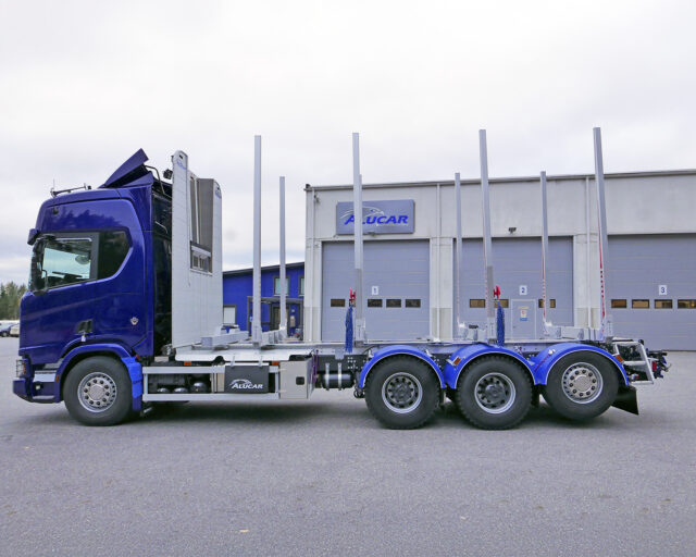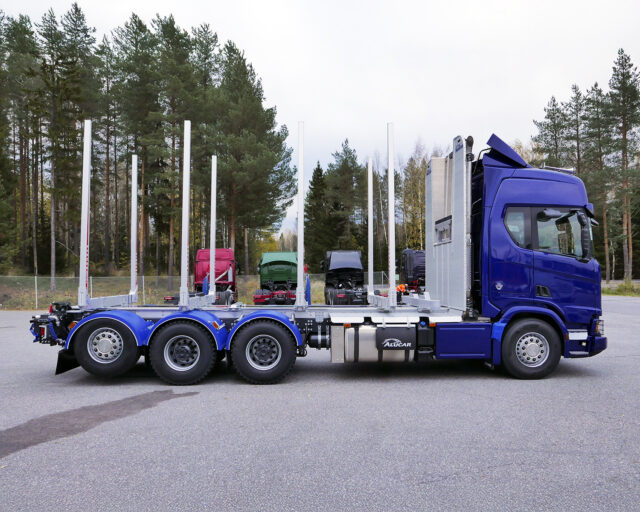 Annat Framstam med gripstöd och LED-lampor, utvändig hylsa för kraninfästning, LS-hydraulik, oljekylare, vattenledningar till kranhytt, pneumatiska lastspännare, tippbart sidounderkörningsskydd, löstagbara stänkskärmar